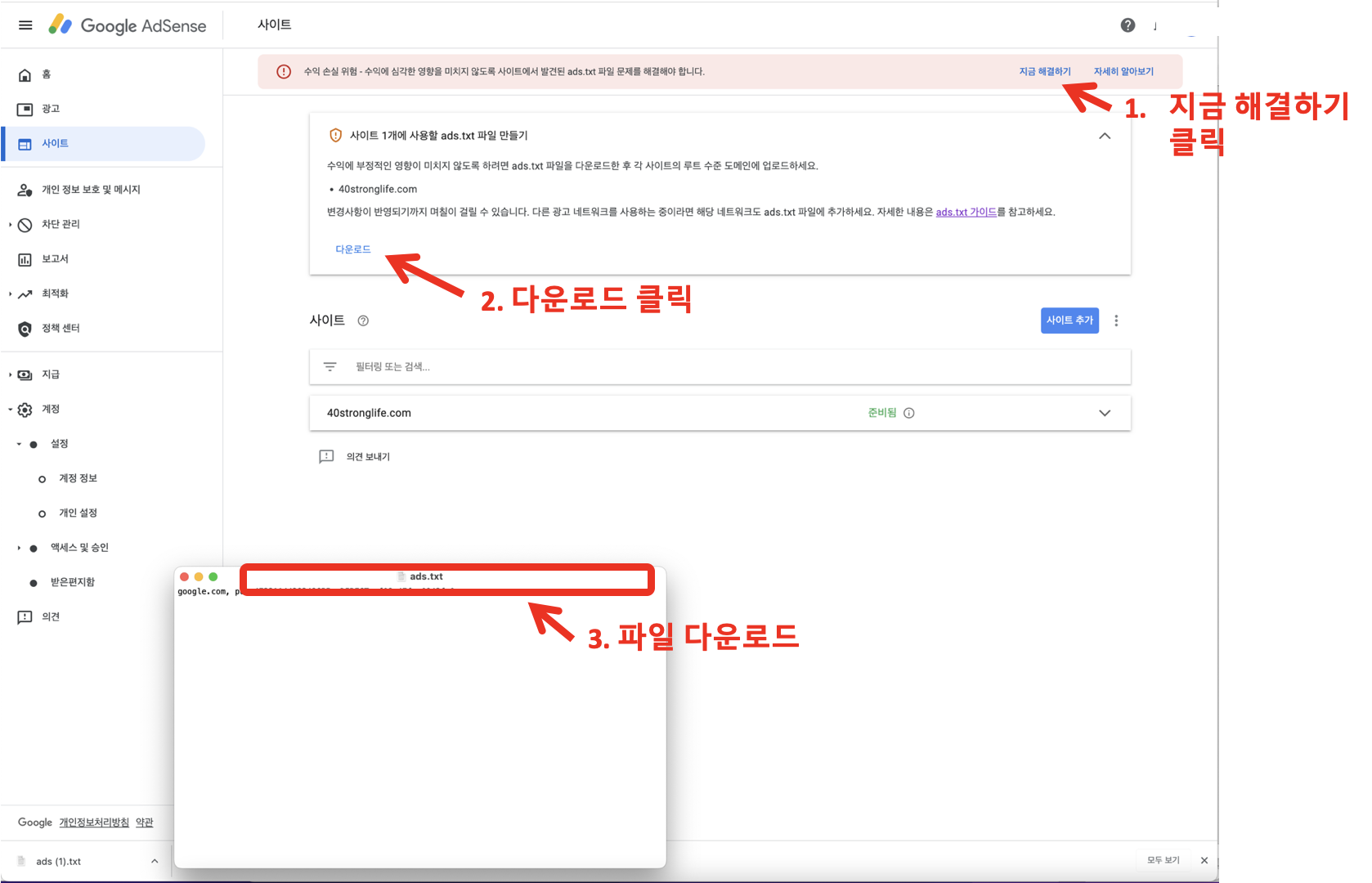 1. 애드센스 알림창에 지금 해결하기를 클릭 후 ads.txt 파일을 다운로드하면 아래 그림의 3번과 같은 ads.txt 파일을 다운로드합니다. 설명을 위해 파일을 열어 캡처한 거니, 실제로는 파일을 열어보지 않으셔도 됩니다.