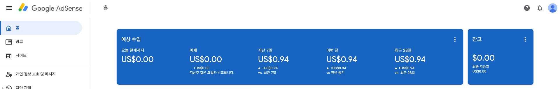 오늘이 애드센스 승인이 된지 4일차 되는 날인데, 1달러미만이지만 수익이 생겼습니다. 금액이 중요하다기 보다, 새로운 도전을 해서 성취했다는 점이 저에게는 의미가 굉장히 큽니다. 앞으로 불혹의 사업일기를 잘 키워 나가보려고 합니다. 제 글이 누군가에게 도움이 되길 바라며, 애드센스를 승인받고 이 글을 읽고 계신 블로거 분들도 원하시는 성취를 이루시길 바랍니다.