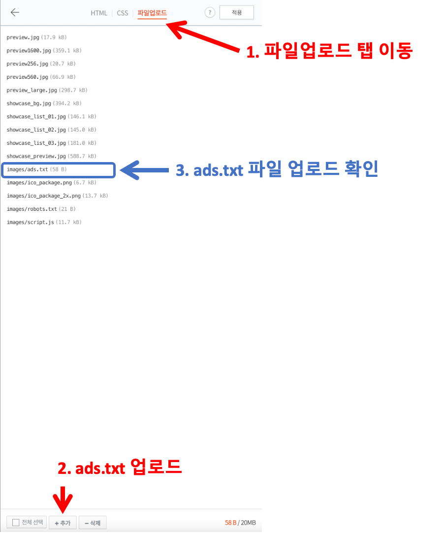3. 다운로드 파일 ads. txt를 업로드하고 파일이 잘 업로드되었는지 확인합니다.