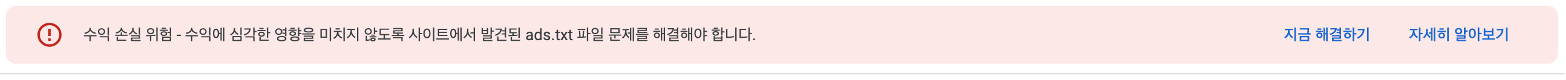!수익 손실 위험 – 수익에 심각한 영향을 미치지 않도록 사이트에서 발견된 ads.txt 파일 문제를 해결해야 합니다.