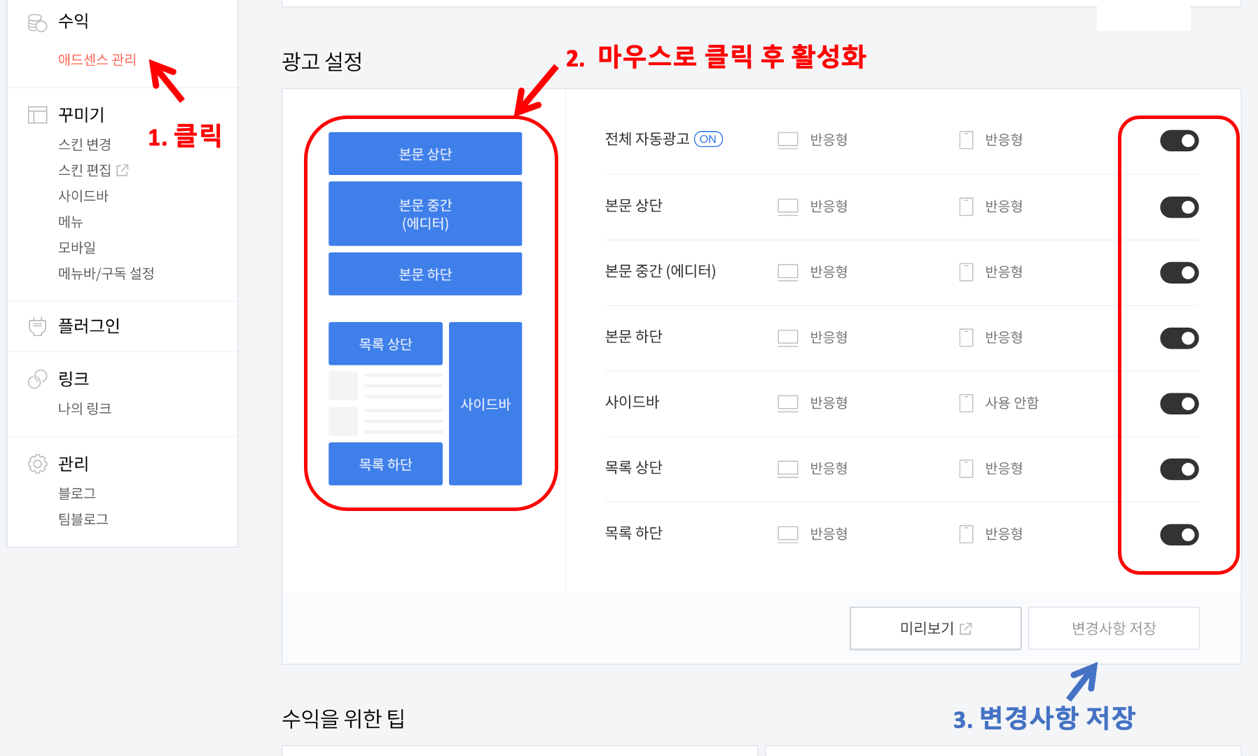2. 광고 설정에서 본문 상단, 본문 중간, 본문 하단, 목록 상단, 목록 하단, 사이드바를 활성화합니다.