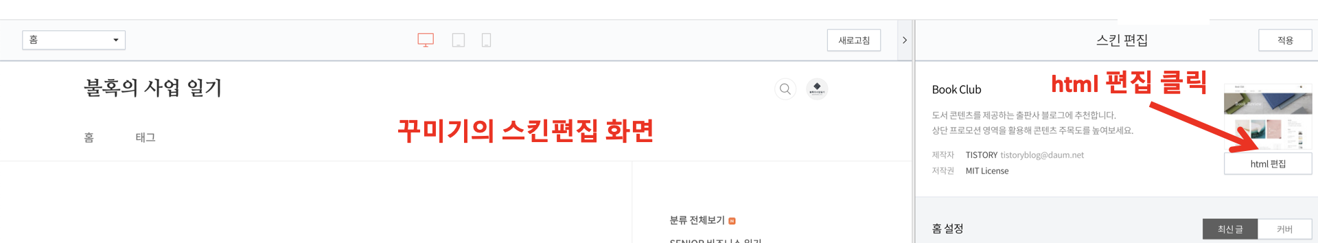 2. 티스토리 블로그 설정에 들어가셔서 꾸미기의 스킨 편집 메뉴를 클릭합니다. 우측상단의 스킨 편집에서 html 편집을 클릭해서 파일 업로드 탭으로 이동합니다.