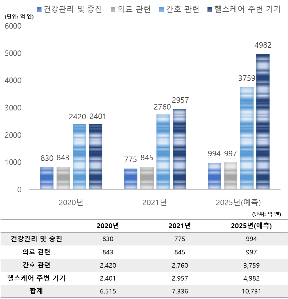 1. 일본의 헬스케어 기기·서비스 시장 규모는 개인, 기업, 지자체, 의료 관련 분야에서 수요가 증가함에 따라 2021년 7,336억 엔(한화 약 7조500억)을 기록함.