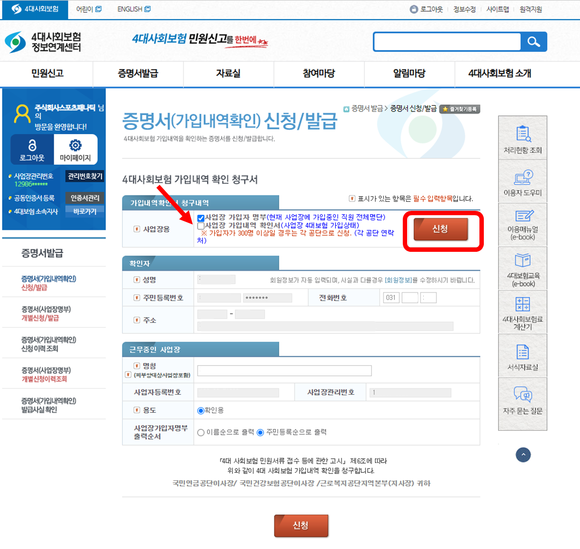 화살표에 있는 사업장 가입자 명부, 사업장 가입 내역 확인서 중 원하는 발급 서류에 체크를 해준다. 둘 다 체크해도 된다. 옆에 신청 버튼 클릭.