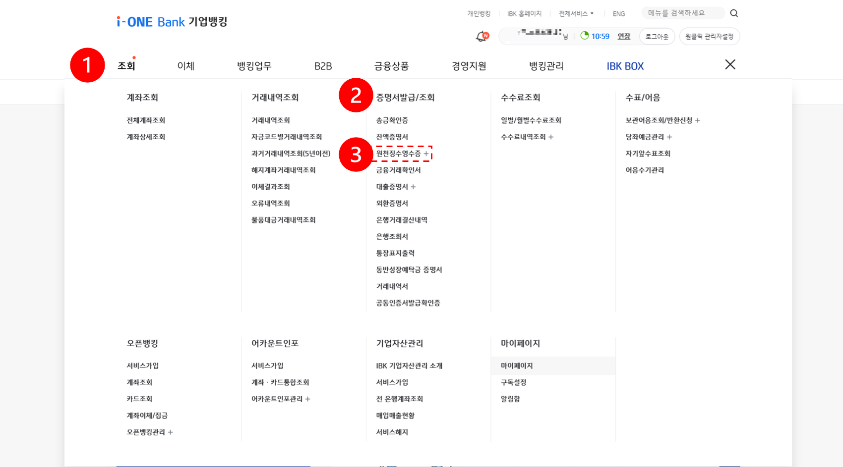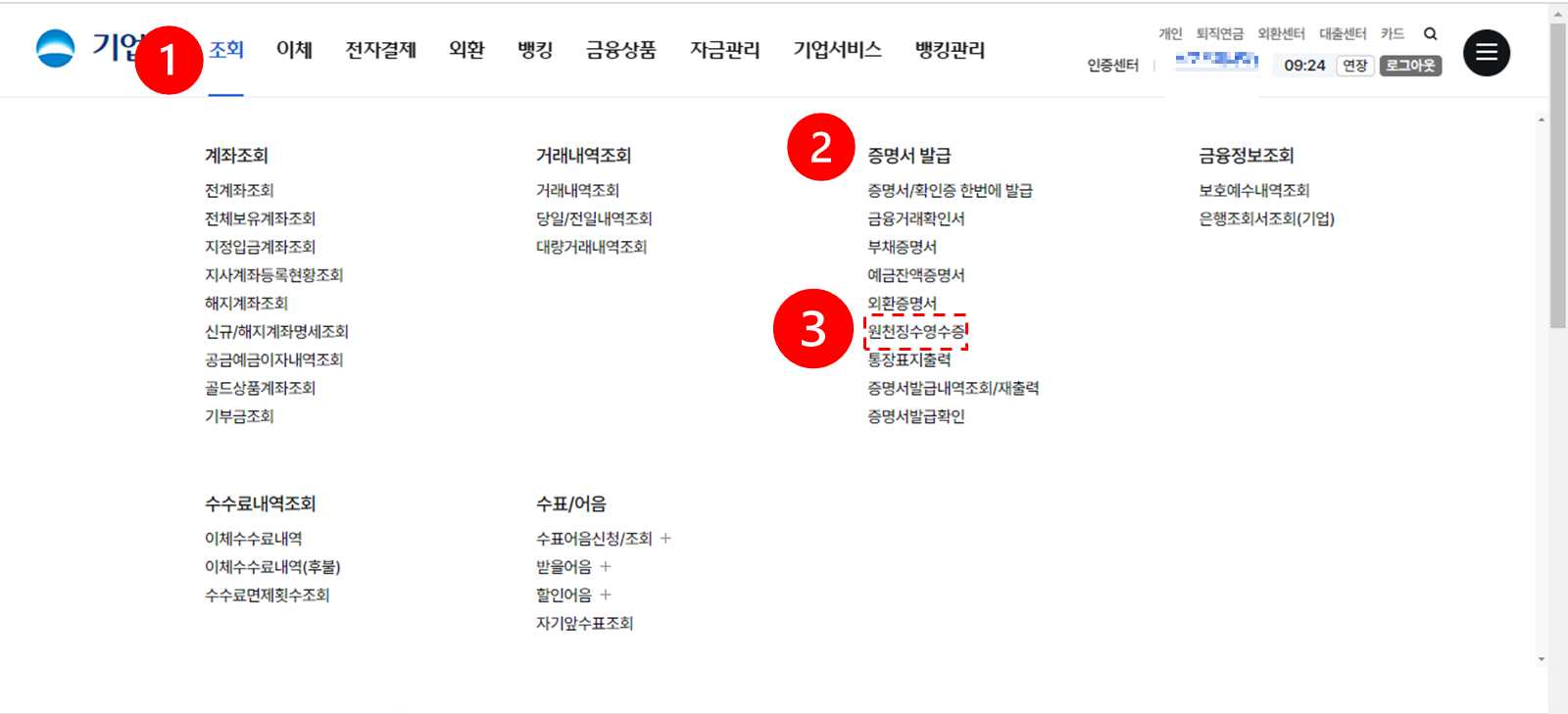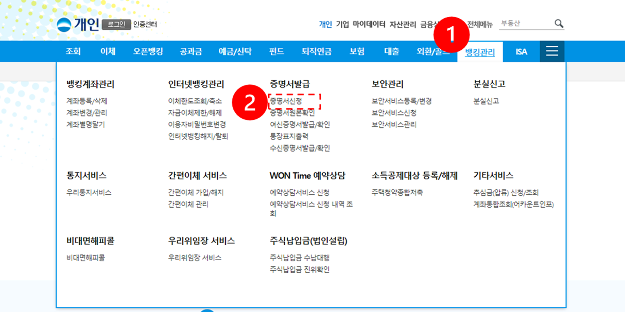 개인은 뱅킹관리 쪽에 증명서 발급이 있는거 같습니다.
