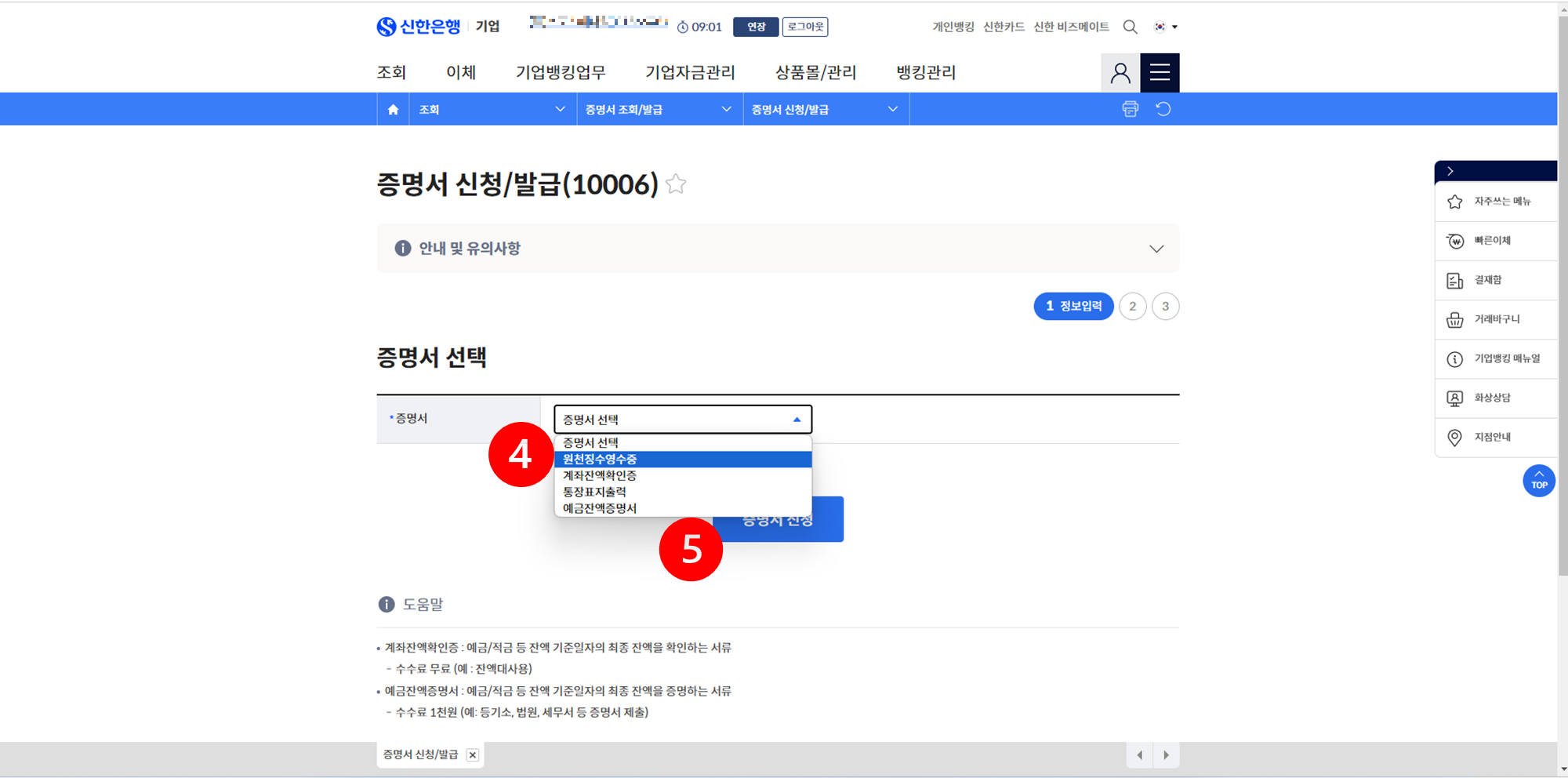 그리고 다음 개인과 법인 그리고 은행별 증명서 발급은 다음과 같이 하면됩니다.