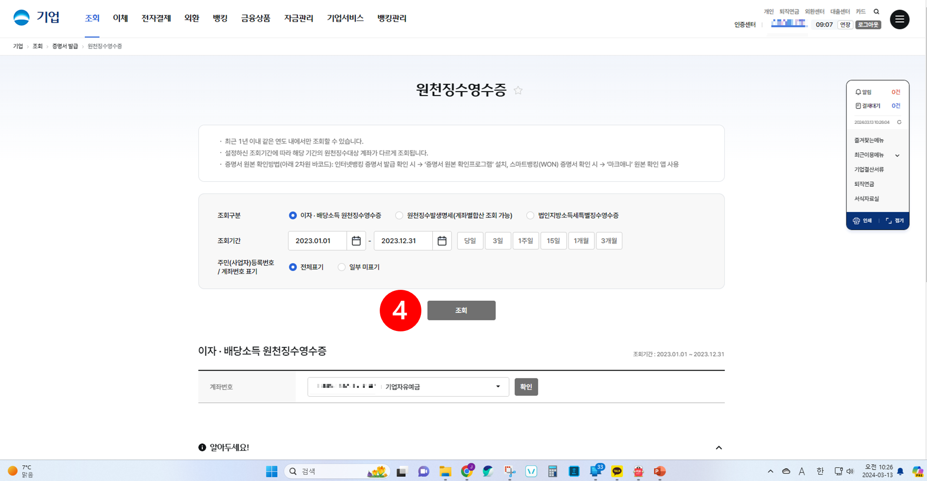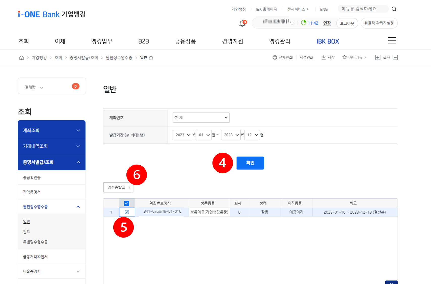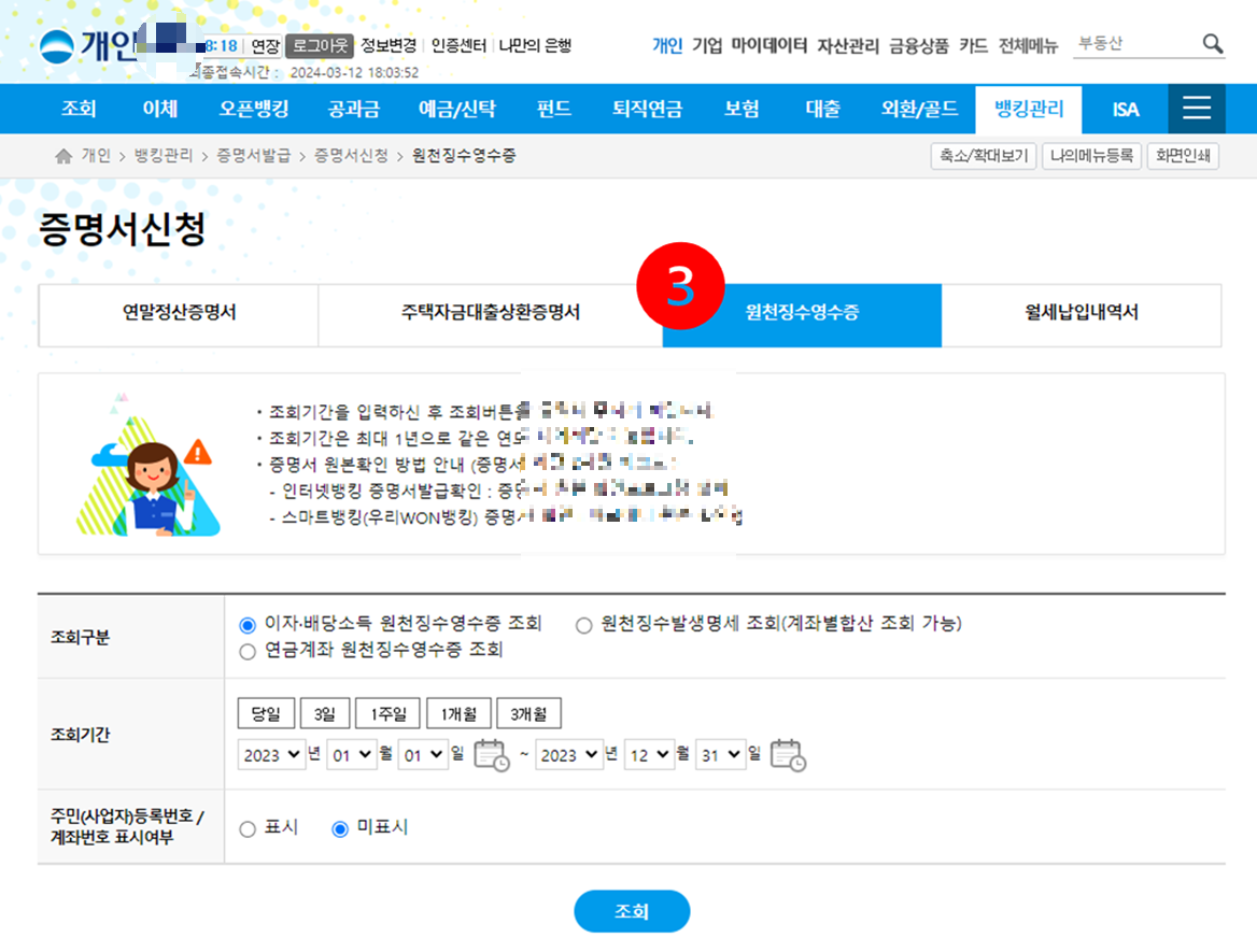 메뉴의 [뱅킹관리] - [증명서 발급]에서 증명서 신청 후 원천징수영수증 탭 클릭 후 조회- 증명서 발급