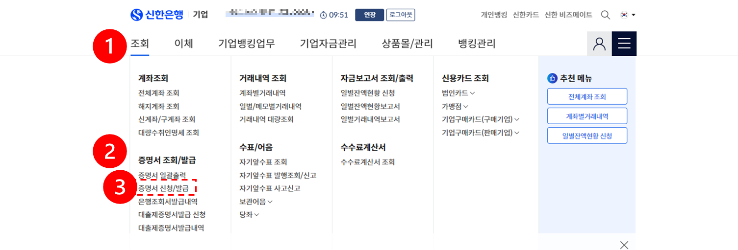 개인은 뱅킹관리 쪽에 증명서 발급이 있는거 같습니다.