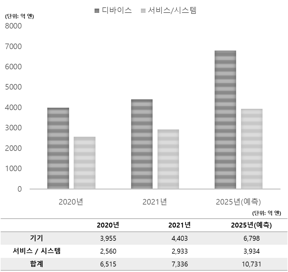 1. 일본의 헬스케어 기기·서비스 시장 규모는 개인, 기업, 지자체, 의료 관련 분야에서 수요가 증가함에 따라 2021년 7,336억 엔(한화 약 7조500억)을 기록함.